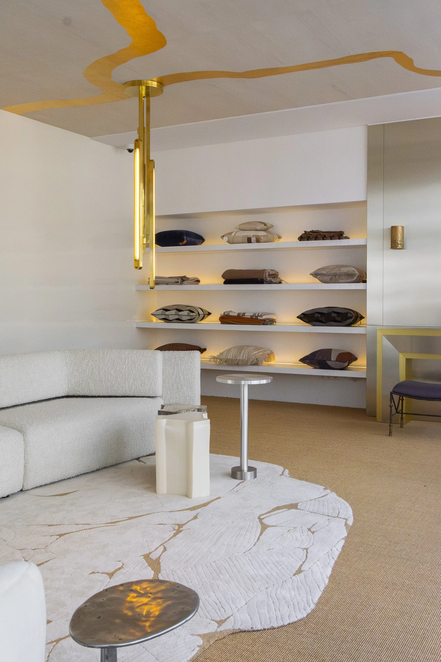 Der Kronleuchter kombiniert die rohe Energie des Messings mit dem weichen Licht, das durch einen naturbelassenen Leinen-Schirm diffundiert wird. Diese Fusion schafft eine Atmosphäre von Wärme und Intimität, die sowohl modern als auch zeitlos wirkt. Mit einer Höhe von 157 cm und einem Durchmesser von 32 cm wird dieser Kronleuchter zum markanten Mittelpunkt in jedem Raum.