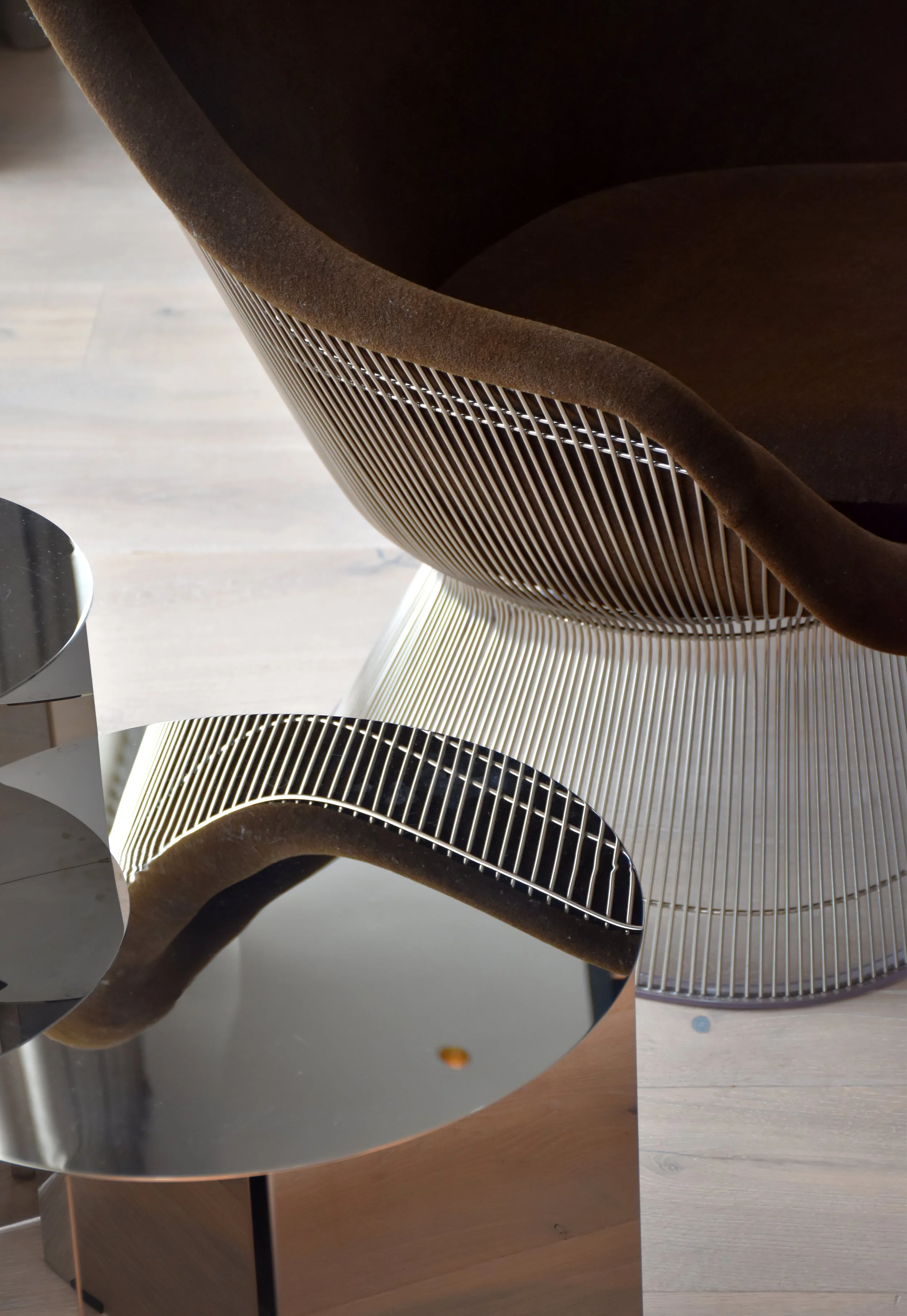 Oak, wool, glass, and graphite shape a space that’s both sculptural and grounded. Curved furnishings float against clean architectural lines, while filtered light accentuates textures and form. The dining area balances bold materiality with calm precision—structured yet effortlessly cool.